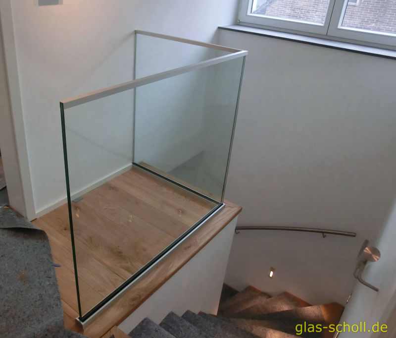 Hier sehen Sie ein Glasgeländer als Absturzsicherung nach TRAV (Technische Regeln für die Verwendung von absturzsichernden Verglasungen). Da die TRAV in Deutschland Glasgeländer nur mit oberem Kantenschutz vorsieht, wurde oben ein dezentes eckiges Profil aufgesetzt.