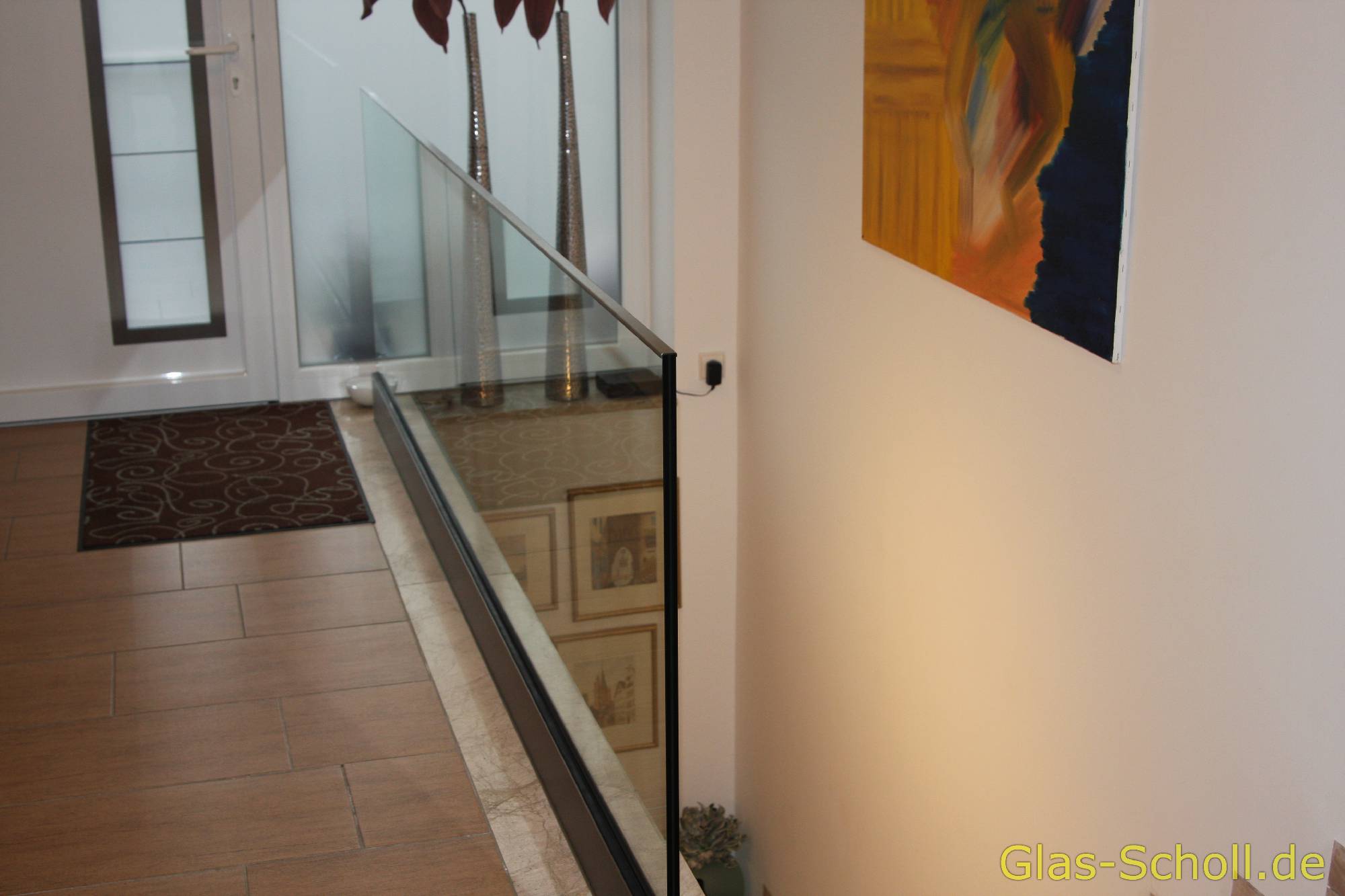 Hier sehen Sie eine rahmenlose Absturzsicherung aus Glas. Realisiert wurde es mit einer entsprechend dicken Verbund-Sicherheits-Glas Scheibe, die aus zwei teilvorgespannten Einzelscheiben gefertigt wurde und unten in ein geprüftes Geländer-System eingespannt wurde. Da die obere Kante, laut Vorschrift, vor Glasbruch zu schützen ist, wurde hier ein extrem schlankes Edelstahl-Profil aufgesetzt. Mit nur 6mm Bauhöhe, fällt es so gut wie gar nicht auf.