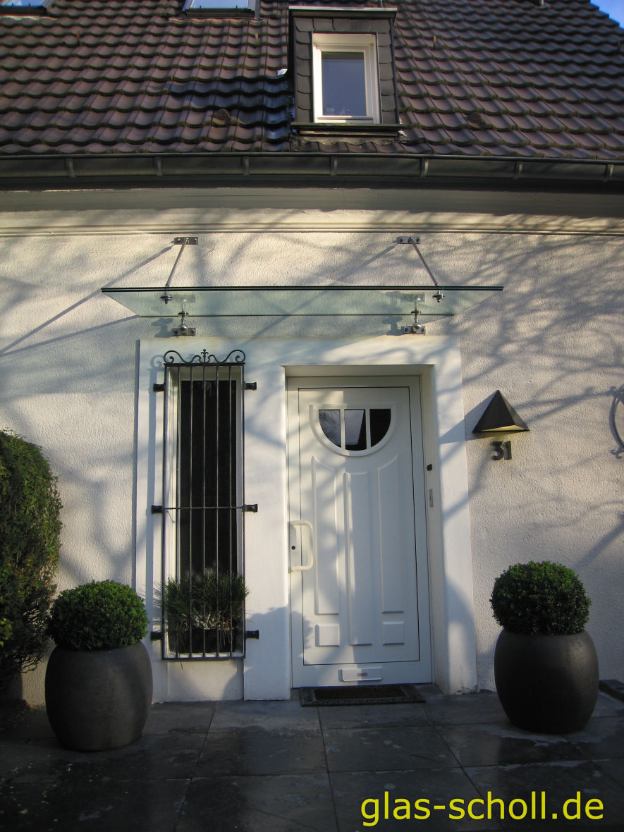 Hier sehen Sie ein wunderschönes rahmenloses Glasvordach, das wir an einem Einfamilienhaus im Jahr 2009 montiert haben. Es wird lediglich mit zwei unteren Punkthaltern und zwei oberen Zugstangen gehalten. Die Wandhalter gibt es auch in runder, dreieckiger, quadratischer oder Rauten-Form sowie mit unterschiedlichem Design. Die Glasscheibe besteht aus 2x Teil-Vorgespanntem-Glas, das mit einer 4-fach PVB-Folie verbunden ist und hat das Maß von 2135 x 1000 mm. Das Edelstahl-Vordach-System ist entsprechend geprüft und hat eine allgemeine bauaufsichtliche Zulassung. Damit das Wasser vorne besser abtropfen kann, wurde die untere Scheibe entsprechend kleiner gefertigt und dadurch ist -mittels Kantenversatz- eine schöne Tropfkante entstanden. Die Tropfkante darf, laut AbZ (Allgemein bauaufsichtlicher Zulasung) nicht größer als 30 mm sein !
