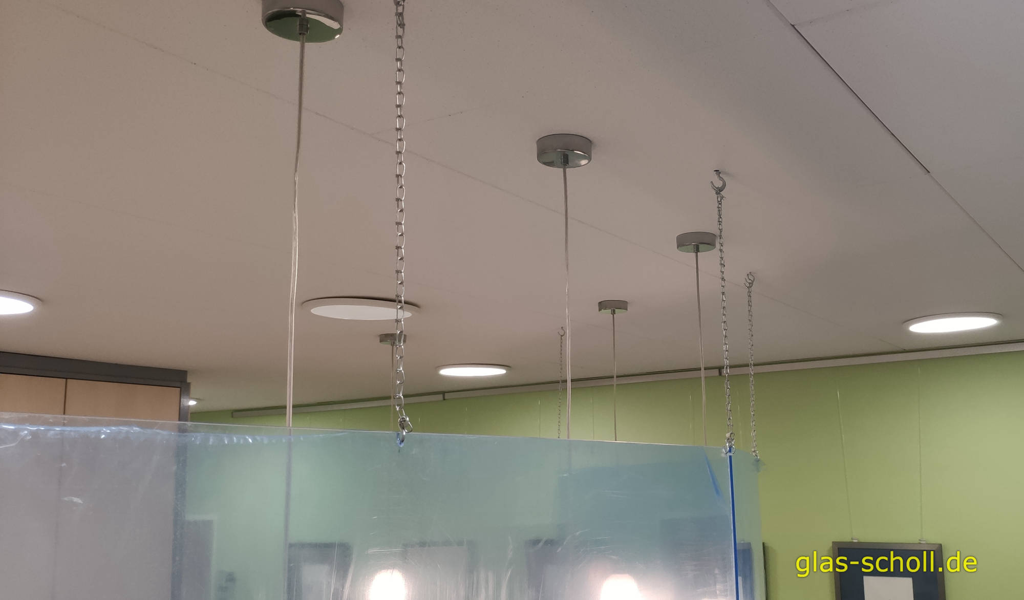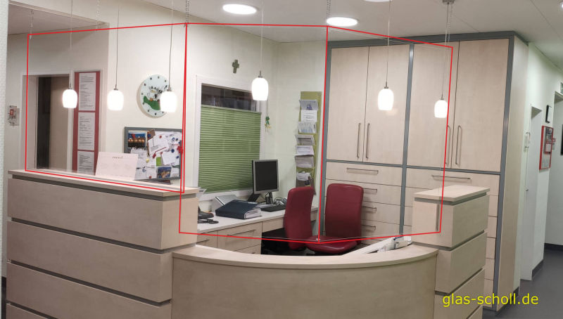 Hier sehen Sie eine transparente Schutzvariante am Empfang einer Arztpraxis. Eine Maßnahme, die innerhalb von 24 Stunden, nach dem Kundenanruf, erstellt wurde. Um Ihre Mitarbeiter sowie Kunden vor Viren-Ansteckung zu schützen, erstellen wir Infektions-Schutzscheiben aus Acrylglas. In der Regel hängen wir diese von der Decke ab, sodass diese im Raum unsichtbar schweben. Da die Kanten geschliffen und poliert sind, kann man diese kaum sehen. Die Gesamtoptik wird somit kaum verändert. Um die fast unsichtbaren Schutzscheiben besser kenntlich zu machen, haben wir diese für Sie auf jedem bei einem Bild mit roten Rahmen hervorgehoben. Die Deckenbefestigung erfolgt sicher mit Spezialdübeln oder hinterlegten Holzplatten. Andere Möglichkeiten aus Acryl- oder Echtglas sind natürlich möglich.