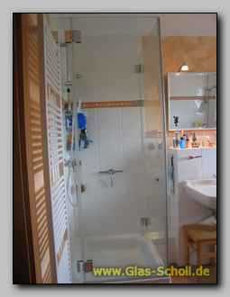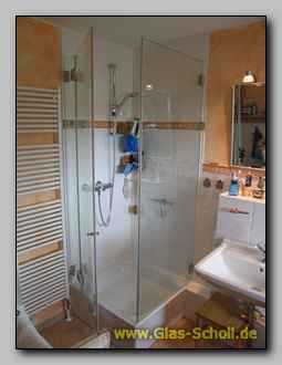 Hier sehen Sie eine 90° Ganzglasdusche mit zwei Seitenteilen. Die Türe wurde nicht an der Wand,