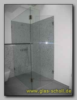 Glas-Seitenteil montiert, das mit 90º Glas-Glas Winkelhaltern an dem hinterem Festteil gehalten wird.