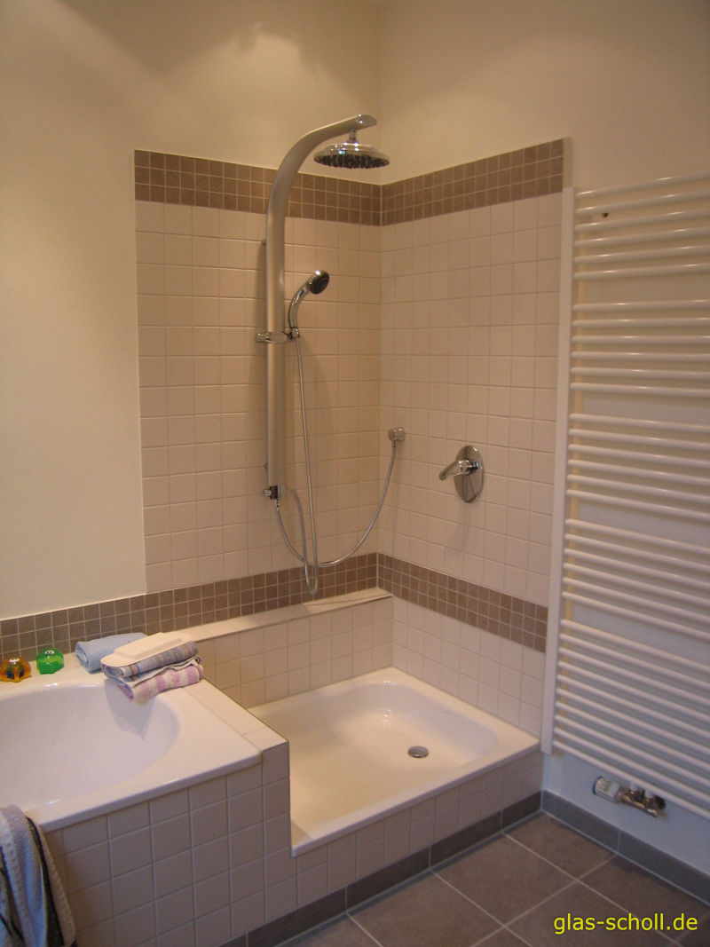 Entgegen der Situation mit überstehender Badewannenkante mußte hier nicht mit einem Glasstreifen oder Modellseitenteil gearbeitet werden, da die Wannenkante nicht übersteht, sondern eckig runtergefließt wurde. Das linke Modell-Seitenteil wurde ganz nah an die Außenkante gesetzt sodaß es mit der Wanne darunter fluchtet. Auf der rechten Seite wurde ebenfalls eine Seitenteil eingeplant, da eine -an die Wand montierte- Türe, auf Grund des Heizkörpers, nicht möglich war. Das linke Modell-Seitenteil wird an der Wand durch die CULT-Winkelhalter gehalten und ist unten zur Wanne lediglich versiegelt. Natürlich wurden auch hier die Scheiben zu Einscheiben-Sicherheits-Glas vorgespannt.