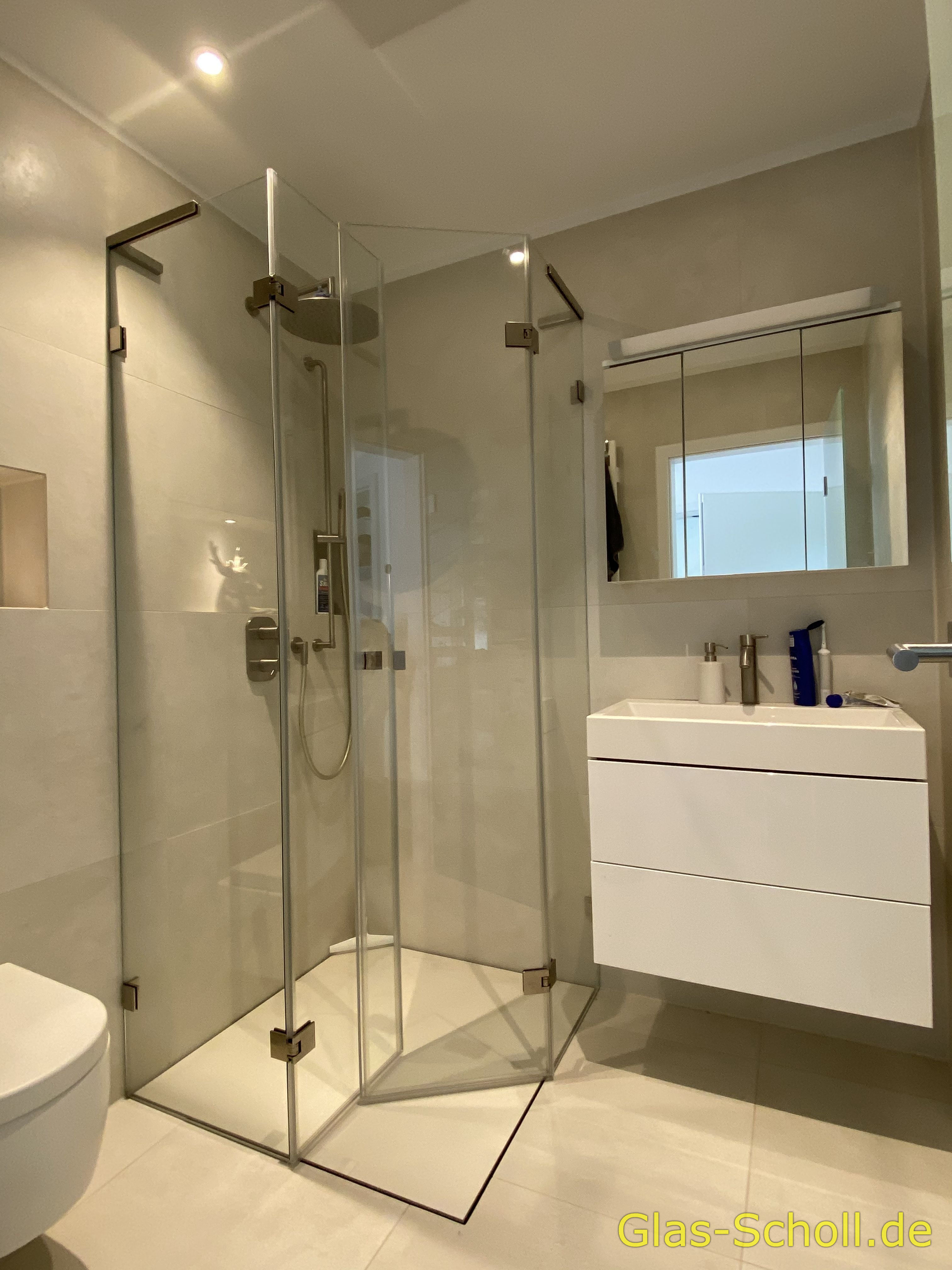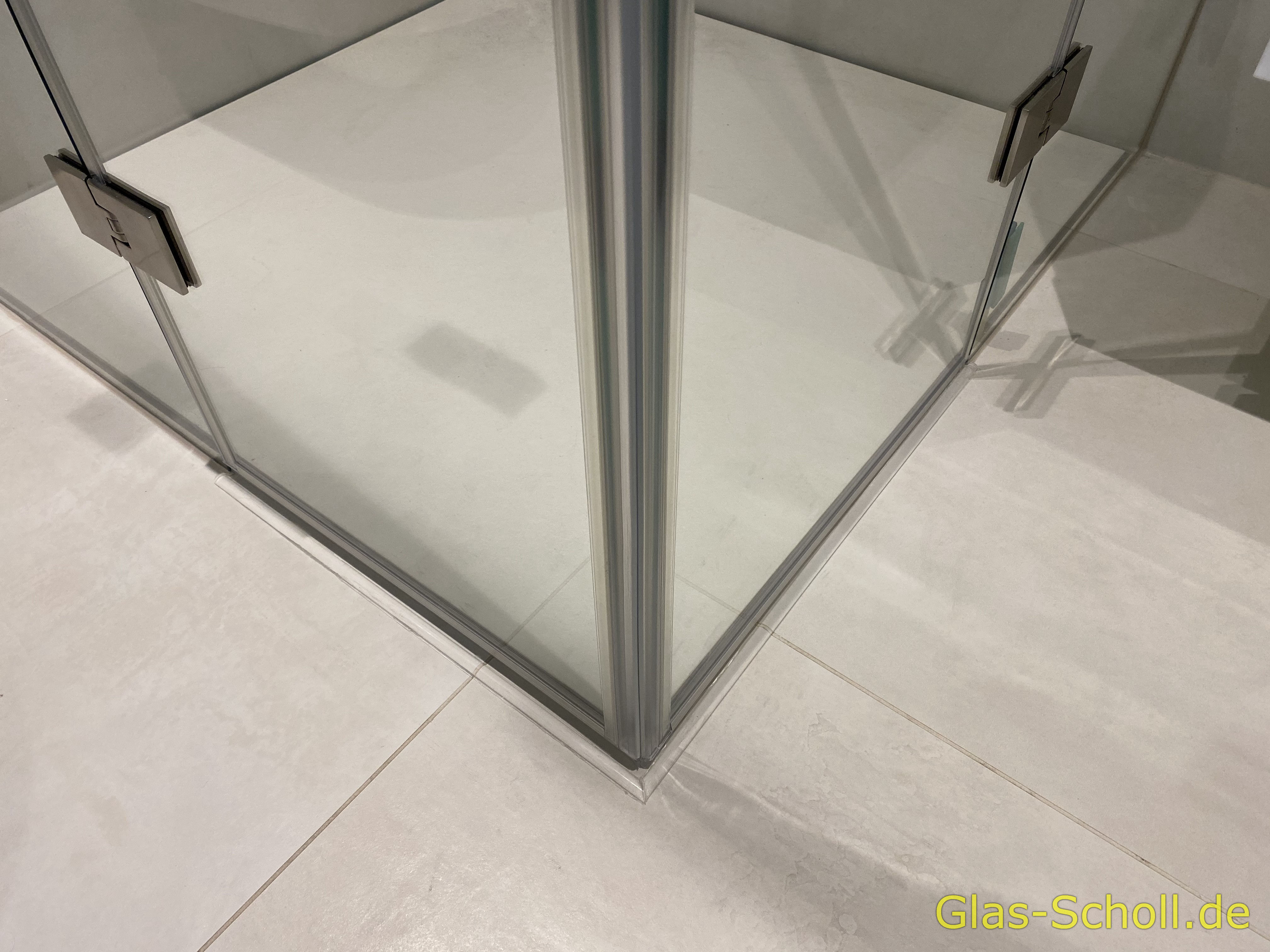 Eckdusche mit zwei Festteilen und zwei Türen. Üblicherweise werden die Seitenteile mit 45° Stabilisierungsstangen statisch stabilisiert. Hier sehen Sie die innovativen neuen Winkel-Stabi´s. Die Oberfläche dieser Beschläge ist Edelstahl-Finish. Die Türen werden durch das geniale Flamea Türband geöffnet.