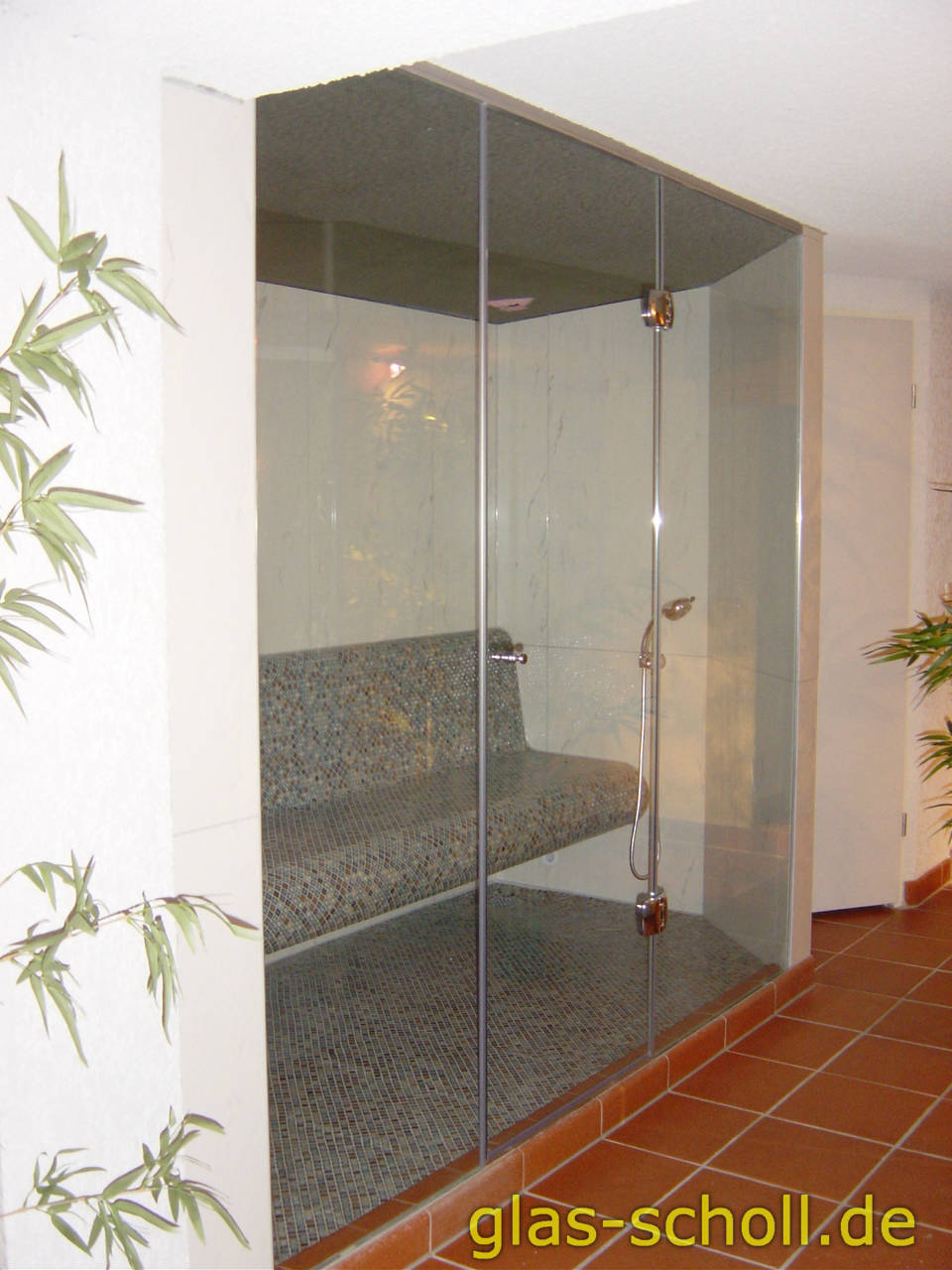 fluchtende Dampfsauna mit Tür zwischen zwei Seitenteilen von Glas Scholl