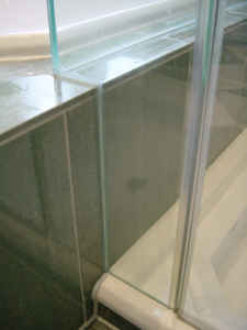 ein Teil der Badewanne als Ablage genutzt werden. Die 90° Eckverbindung wurde mit einer UV-Glas-Glasverklebung versehen. Das Seitenteil wird wandseitig mit verchromten 90° Glas-Winkelhaltern gehalten und ist zu