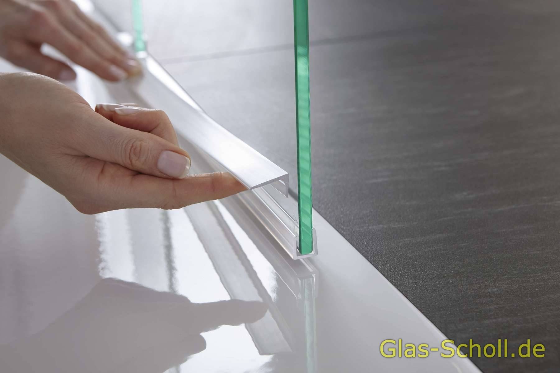 Hier haben wir eine Dusche mit Schiebetür-Eckeinstieg und Modellausschnitt im Seitenteil erstellt. Das filigrane Aquant 40 Dusch-System mit nur 50 mm Höhe und 57 mm Tiefe beinhaltet das innovative beidseitige Dämpfungssystem.