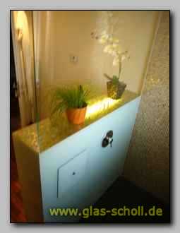 In diesem Bad sollte die komplette Waschtischkonsole dreiseitig mit lackiertem Glas versehen werden und zusätzliche sollte eine Spritz-Abtrennung zu der dahinterliegenden Dusche geschaffen werden.