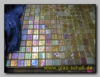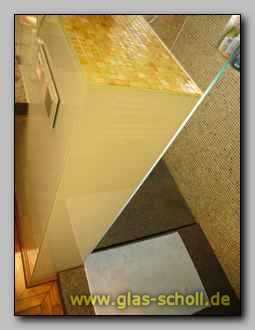 Modellscheiben ganz passgenau zu fertigen ist eine Sache, aber diese "knappen und raumhohen Scheiben" dann später auch in das Bad sowie dort auch aufgerichtet zu bekommen ist ebenfalls eine Kunst für sich. Die Lackierung des Glases wurde mit Emailfarbe nach einem ausgewähltem RAL-Ton im Rollercoat-Verfahren beschichtet, die keramische Farbe wurde in die Glasoberfläche eingebrannt, das Glas dann zu Einscheiben-Sicherheits-Glas vorgespannt und anschließend verklebt. Als Ablage auf der Waschbecken-Konsole sollte ebenfalls eine durchscheinende Mosaikablagegeschaffen werden, die später von unten beleuchtet, wirken soll. Dazu wurden die gelieferten Mosaikstein-Matten auf eine klare Glas-Trägerscheibe aufgebracht und die Netzmatte, die sich eigentlich mittels Feuchtigkeit lösen sollte :-) , wurde dann -leider sehr mühsam- wieder abgeschrubbt :-). Wieder mal eine sehr schöne Badgestaltung, mit vielen erstellten Modellscheiben, die zeigt was alles möglich ist.