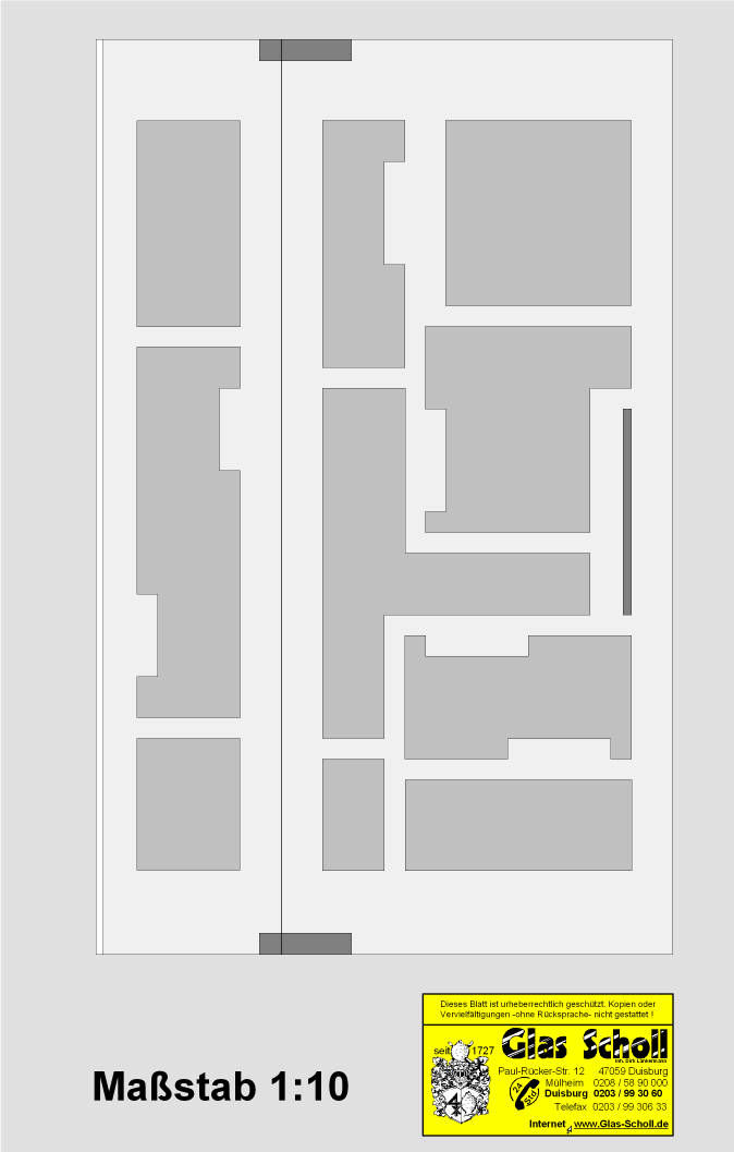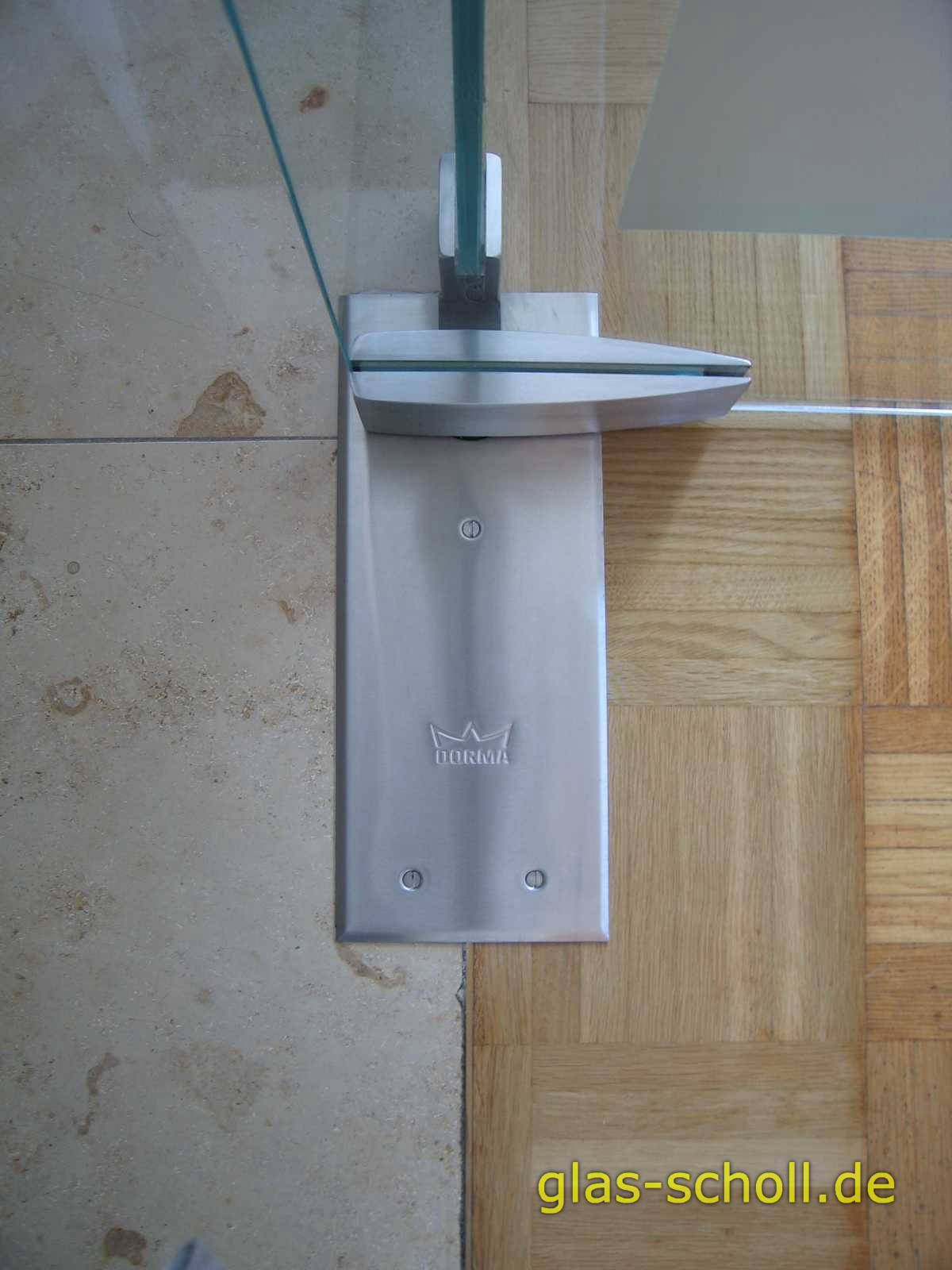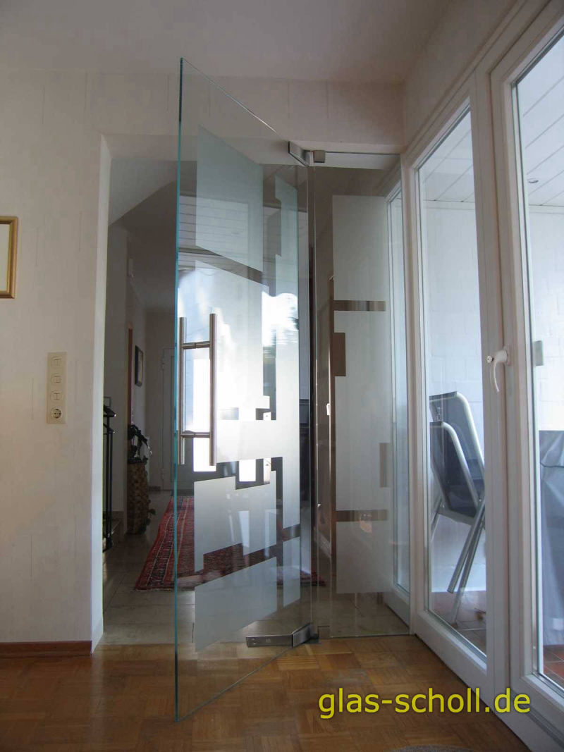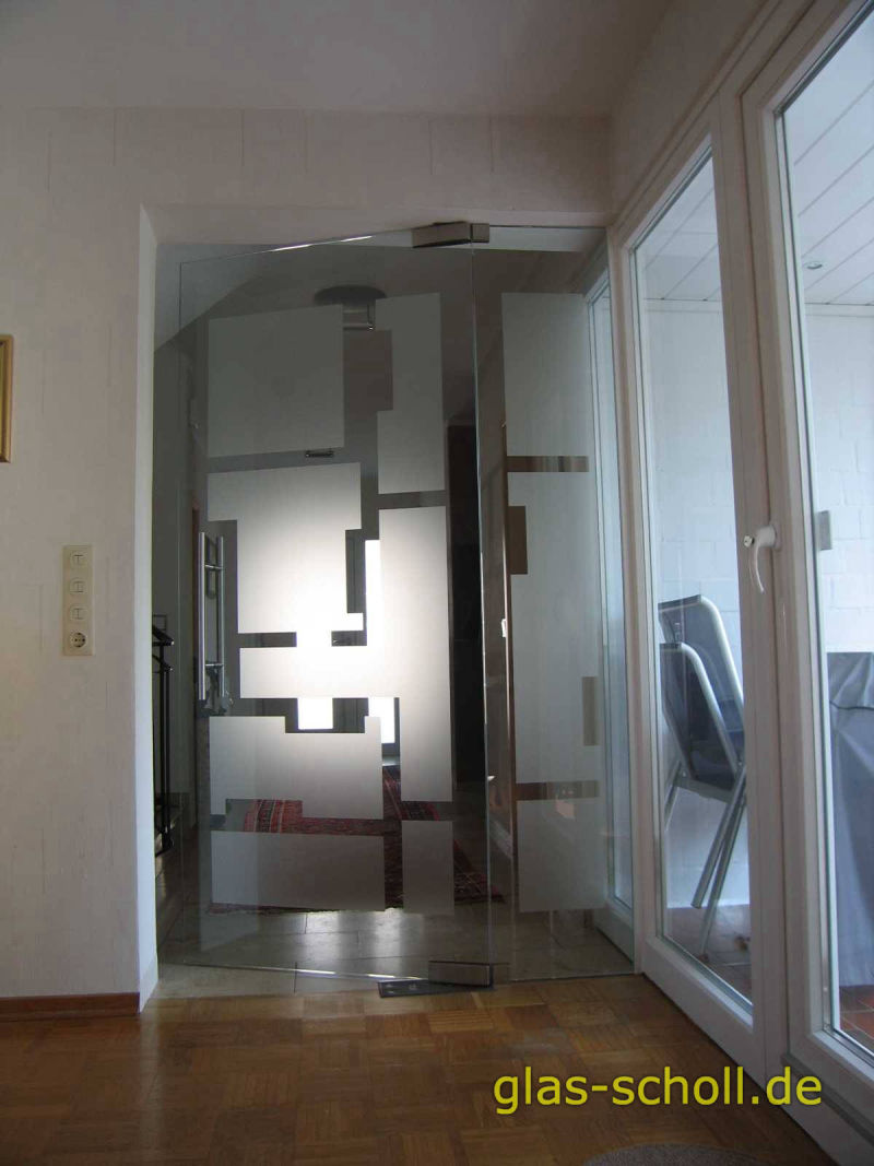 Hier sehen Sie eine zweiteilige Arcos-Ganzglasanlage mit einer Pendeltüre und schmalem Seitenteil. Das Glas ist selbstverständlich Einscheiben-Sicherheits-Glas, das zuvor im Ofen vorgespannt wurde. Die Türe sitzt auf einem Bodentürschließer und wird somit automatisch sanft in den Nullpunkt geschlossen. Wie der Bodentürschließer in den Boden eingebaut wird, können Sie in der Fotodokumentation sehr schön sehen. Das gewünschte moderne Dekor-Muster wurde mit Sandstrahl-Effektfolie realisiert. Das Seitenteil wird mit Punkthaltern rahmenlos gehalten.