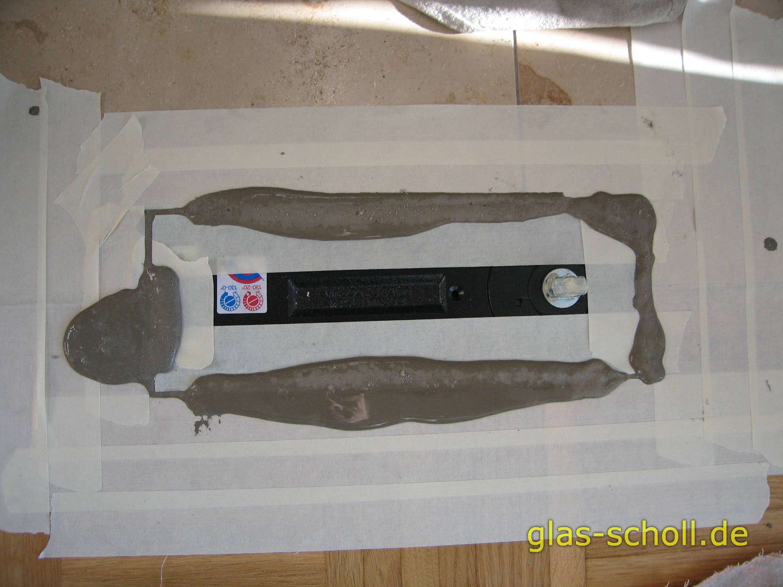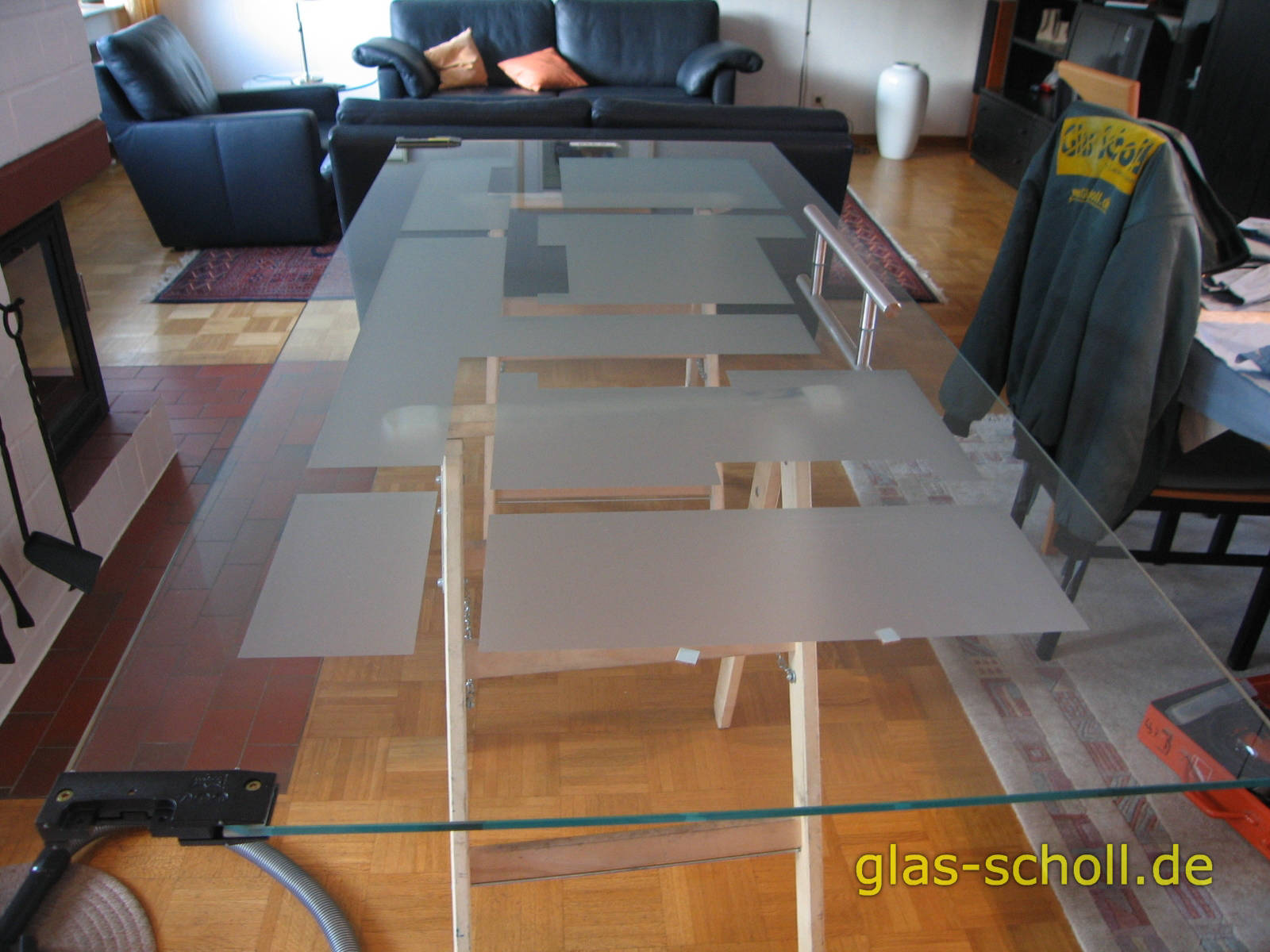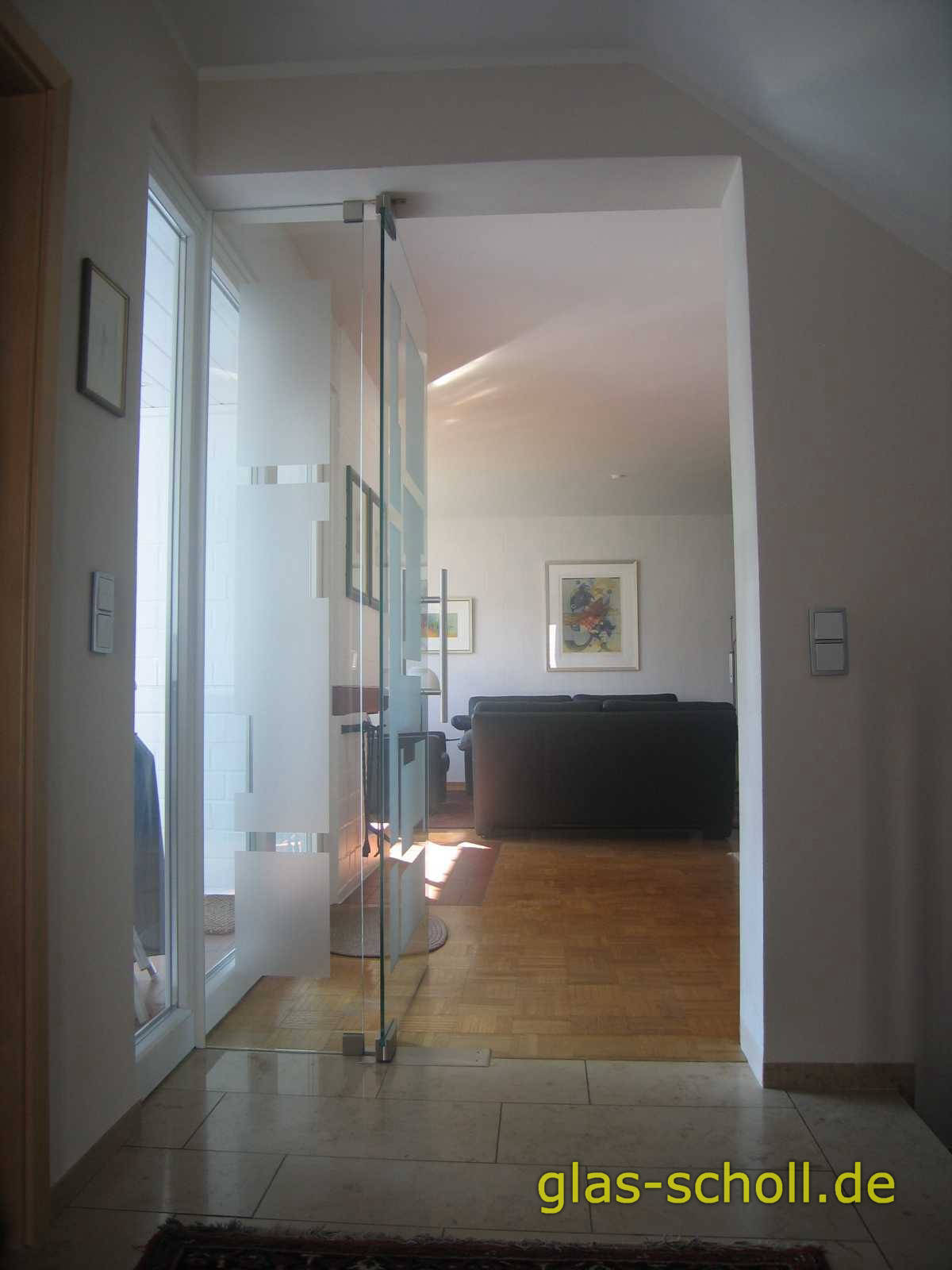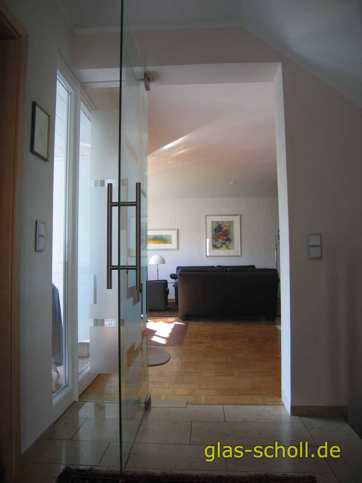 Hier sehen Sie eine zweiteilige Arcos-Ganzglasanlage mit einer Pendeltüre und schmalem Seitenteil. Das Glas ist selbstverständlich Einscheiben-Sicherheits-Glas, das zuvor im Ofen vorgespannt wurde. Die Türe sitzt auf einem Bodentürschließer und wird somit automatisch sanft in den Nullpunkt geschlossen. Wie der Bodentürschließer in den Boden eingebaut wird, können Sie in der Fotodokumentation sehr schön sehen. Das gewünschte moderne Dekor-Muster wurde mit Sandstrahl-Effektfolie realisiert. Das Seitenteil wird mit Punkthaltern rahmenlos gehalten.