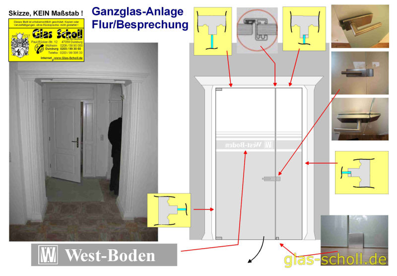 Die profilierte Zargen-Situation ließ es zunächst nicht zu, eine Ganzglas-Anlage zu montieren. So wurde die profilierte Stuck-Zarge eingeschnitten und innen eine, teilweise stumpfe, Blockzarge eingebaut (siehe Skizze). Da es sich um einen Konferenz-Raum handelt, sollte im Gegensatz zu üblichen Ganzglas-Anlagen, die mit ca. 2-3mm Luft zwischen den Scheiben montiert werden, hier mit Anschlagdichtungen gearbeitet werden. Die Anschlagtüre wurde mit einem Bodenlager (keine automatische Schließung, wie bei einem Bodentürschließer) montiert und der Studio Classic-Schloßkasten schließt in den dezenten Arcos Gegenkasten, der im Festteil montiert wurde.