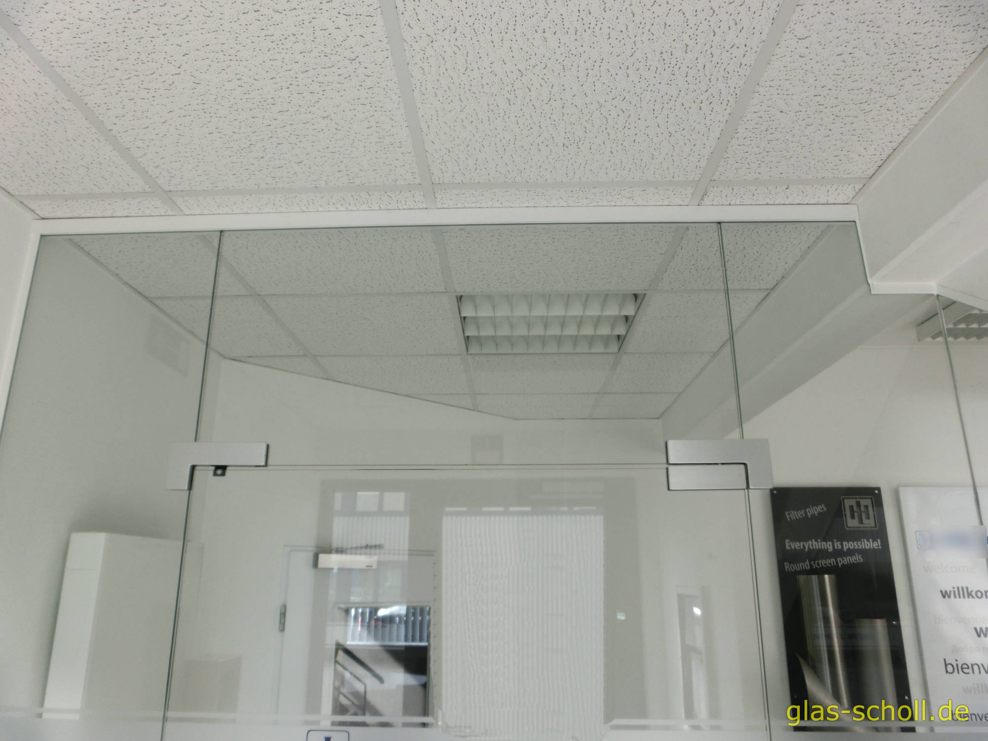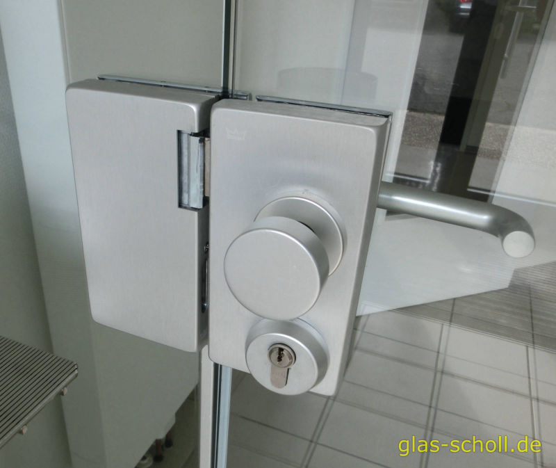 Die Anmeldung erfolgt für Gäste über Telefon und die Mitarbeiter sollen mit Chipkarten Zutritt erhalten. Somit erstellten wir eine Ganzglas-Anlagen-Abtrennung als Windfang und Zugangskontrolle. Der Schlosskasten wurde mit einem E-Öffner versehen, der über die Chipkarten-Zugangskontrolle geöffnet wird. Die Türe ist entsprechend breit ausgeführt um den Fluchtweg zu gewährleisten. Des Weiteren wurde die Schließeinheit mit einer Panikfunktion versehen, die im Falle einer Verschließung durch den Schlüssel, das verlassen von innen "ohne Schlüssel" ermöglicht. Auf Grund der Türbreite von 120cm wurde im unteren Bereich mit einer durchgehenden Klemmschiene gearbeitet. Dieses ist bei schmaleren Türen nicht nötig und dann kann, wie oben auch, ein dezenter unterer Beschlag verwendet werden.