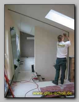 Wenn man die Treppe rauf kommt ist links das Badezimmer. Hier sollte ein Raumteiler aus Glas mit