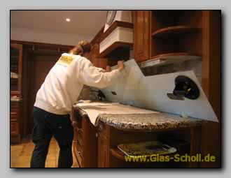 Hier sehen Sie einen sehr langen Küchen-Spritzschutz aus lackiertem Glas. Die lange Scheibe mißt über 300 cm und
