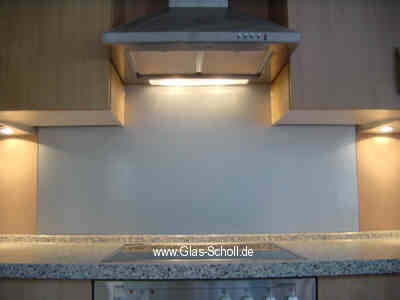 Als Küchenfliesen-Spritzschutz wurde hier modernes Ornamentglas Mastercarré auf Maß zugeschnitten und die Kanten umlaufend geschliffen und poliert.