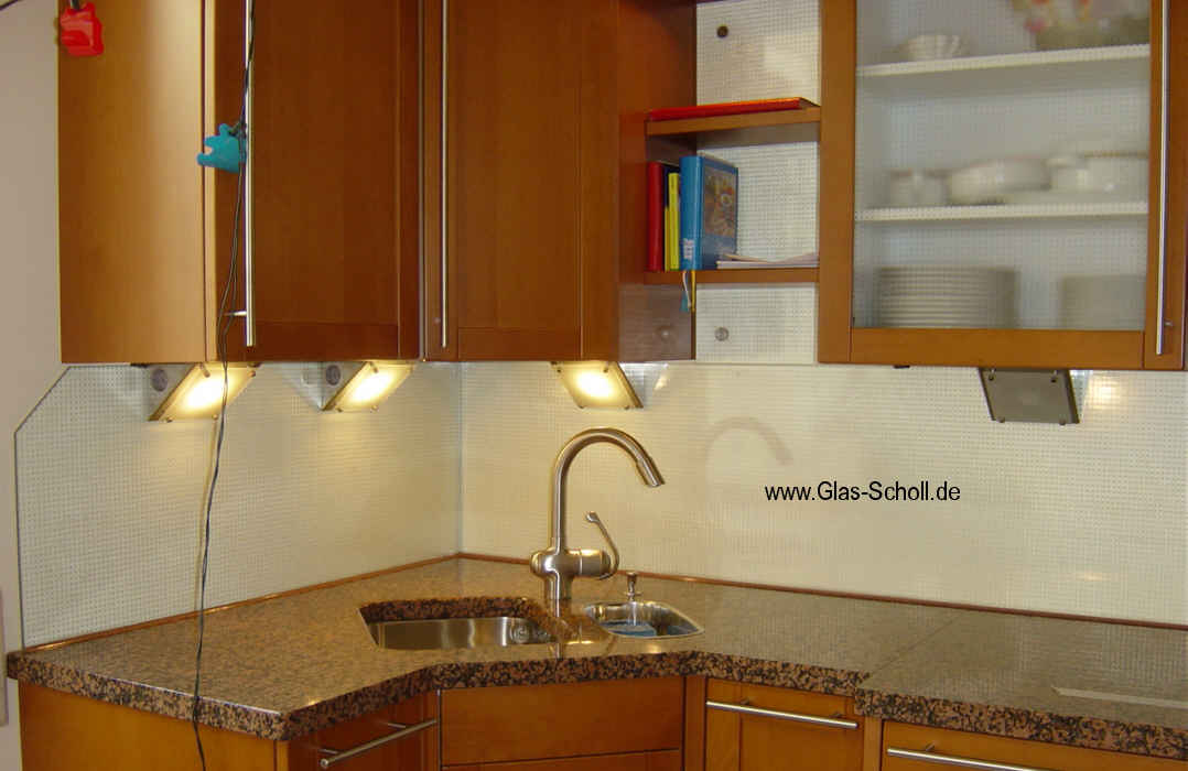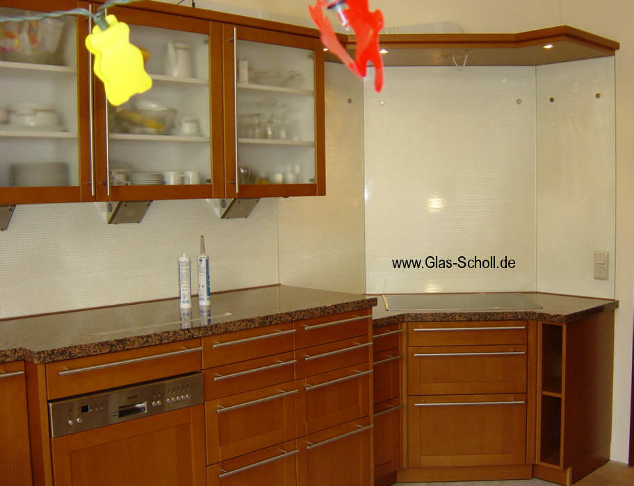 Als Küchenfliesen-Spritzschutz wurde über die komplette Breite der Küche Ornamentglas Mastercarré weiß gewählt.