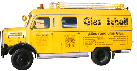 Die Firma Glas Scholl erwarb einen alten Feuerwehrwagen. Einen Borgward aus dem Jahr 1959. Dieser wurde restauriert und dient als Containerfahrzeug bei größeren Aufträgen.